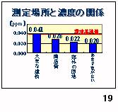 生活環境と濃度の関係を調べるために、協力者には測定場所を分類して書いても らいました。分類は1.大きな建物がある町の中 2.商店街に近い町の中 3.郊外の住宅地 4.まわりにあまり家がない 5.家の中 の5つの分類です。 |
