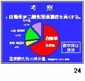 今回の研究でインターネットを使い、多くの協力者と同じ問題を考えることがで きたのは大きな成果でした。 研究結果より、二酸化窒素の濃度と自動車排ガスとの因果関係が明らかとなりまし た。しかし、自動車を無くすわけにはいかないので、こらからの環境を守っていく ためには一人ひとりの心がけが大切であると思います。以上で発表を終わります。 |