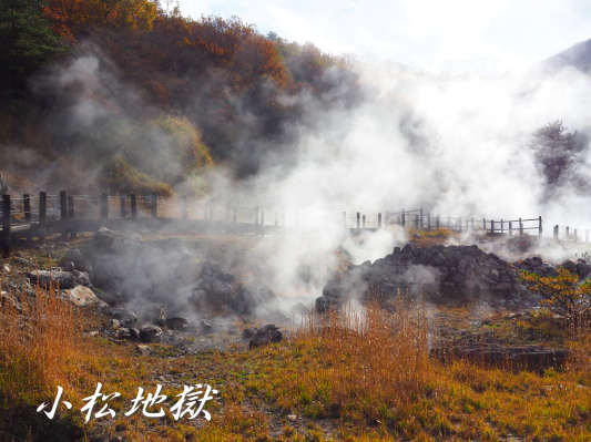 筋湯温泉の先にある小松地獄。災害で行けなくなっていた遊歩道が綺麗に整備されました。相変わらずの噴煙と硫黄の臭いが漂っていました。