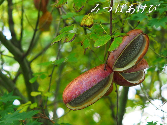 アケビが熟しています。うちにあるのはミツバアケビ。