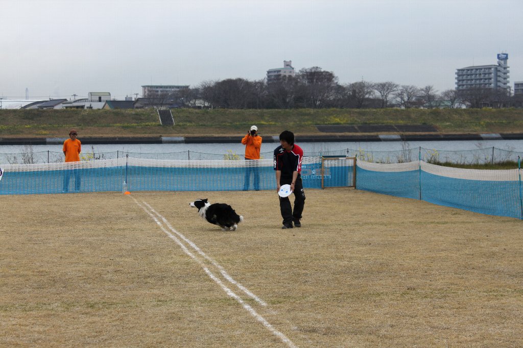 ディスクドッグ 投げたフライングディスクを追い掛けて持ち帰るという犬の本能を利用した遊びから