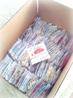 協力頂いた団体・有志の名称を載せたチラシをひとつひとつに手作業で封入したシュシュ及び箱詰めした状態です。