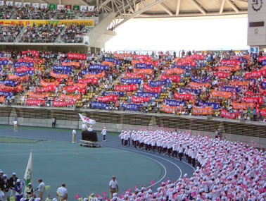 歓迎演技やボランティアのあいさつは感動でした。選手団が、入場行進して進むと最後のコーナーでは各県の応援幕が張られ、選手団の歓声が一際大きく聞こえてきます。その瞬間が一番好きでした。そして、最後は、すべての横断幕ががんばれ大分に変わりました。圧巻でした。