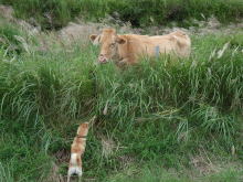 持ってのフレンドリー精神で、牛さんとも友達になろうと、びびりながらも近づくが・・・ |