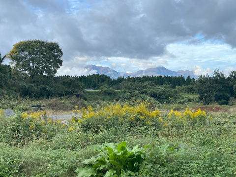 当店より ※中央の阿蘇山高岳右下の雲は噴煙、左、根子岳