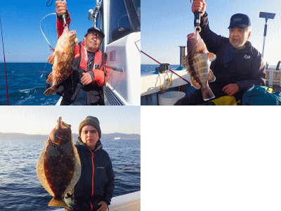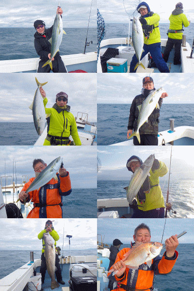 | 当初予定のポイントが時化予報!湾内チャレンジは可能でしたので相談して泳がせで釣行してました。餌鯵の反応は良好bb前回の泳がせは人間の餌サイズの鯵ばかりでしたが今はフィッシュイーターの餌サイズ♪鈴なりに釣れるので助かります♪生簀に活かしてポイントをまわりましたが今日も一日跳んでる潮で苦戦(泣)先日の泳がせで好調でした青物も1本のみ・・・苦戦を強いられながら皆さん頑張って頂きました。鮃、ハイカラ、タカバ、チビ五郎・小五郎・大五郎、人間の餌サイズ鯵、カイワリなどで鯵一族は余裕の全員安打で終了です♪♪♪鯵子の反応はメチャ良いですが落し込みファンの方は今しばらくお待ちくださいm(_