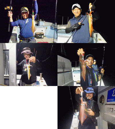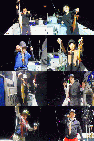 NIGHTゲーム:写真は参考サイズを見て頂くためサイズは大・中・小ですがトトロの傘サイズは全員数杯GETしてますbb今日はボチボチの活性でダラダラとバイト&ヒットの余裕の全員安打♪初挑戦の方で20杯超え、一番釣った方で37杯ほか触腕のみ数杯やバラシもあり(^^;)盆明けにむかってサイズも良くなってきてますbb見えるだけ居るので釣って下さい!!(≧▽≦) |