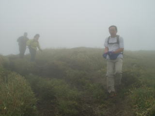 (コースをなぞるように入力していないので) 導いてはくれないことを知った上での逡巡だったと思うが、ともかく己の男気発言?に翻意した夫婦ご一行様は踵を返し、即席の4人パーティとなってガスの山頂を目指すこととなったのだ。ボクの「旅は道連れ、世は情け」的な発想は「まぁ、初夏の九重ではないか、ガスの中でも何とかなるじゃろ」との安易な思惑に基づくものだったが、実は北峰に辿り着いたものの、ガスに巻かれてひととき迷った。「何とかならなかった」のである。 と言うのも未踏ゆえの悲しさか、お鉢巡りのイメージが湧かない。頼みのGPSによると、大鍋の縁をどんどん下っているようだが、主峰からはだんだん離れて行くのだ。どうもお鉢を左回りへと取ったらしく、主峰へは遠回りのルートを踏んでいるとの結論に達した。であれば潔く引き返し、北峰手前から右へのルートを取ったが、この間10分以上濃霧、烈風の中、うごめいたことになって内心少々焦ったことも吐露しておこう。 ![]() 視界不良の中、見知らぬ夫婦を先導して責任重大だ(本峯山頂付近) さて仕切り直しのお鉢めがけて急降下すると、なるほど大鍋の底とおぼしき窪地に降り立ち、今度は一気に標高差120mほどを直登。難儀の末、無事主峰(1745m)へ踊り出たが、人心地はついたものの濃いガスと強風に長居は無用であった。しかしまったくこの三俣山山頂部一帯は道標もなく、草原の似たような丘がつづくので、ガスに巻かれたら、なかなか方向取りが難しいことを改めて痛感した次第。 @やみくもに突き進まないこと。特に視界不良時の憶測猛進行動は慎むべし。 Aハイテク機器はあくまでも補助手段と捉えること。先ずは地図とコンパスの基本に立ち返るべきか。 と、まだまだ発展途上のおじさん二人には改心の余地多しであって、そこのところをノーテンキ挾間おじさんはどれだけ理解しとるとやろか? 白昼露天に浸り屈託のない表情を盗み見ると、ちと心もとない気がしないでもないが、こちとら午後の部を控えて忙しいゆえ、先ずは先輩にゲタを預けるのみである。 (コースタイム) パート1 星生倶楽部6:59→長者原7:05→自然観察路への分岐7:17→指山への道標7:28 29→指山7:54 59→岩場8:17→三俣北峰8:33 47→三俣本峰9:00 05→すがもり越9:33 44→長者原10:25→星生倶楽部10:32 (露天風呂入浴&小宴会) 同行者 挾間 Photo by Hasama