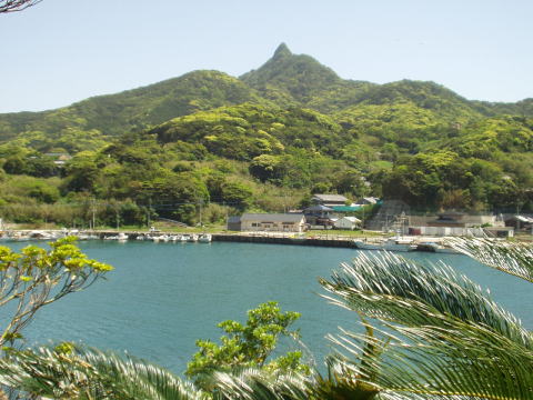 高瀬の弁によると、志々伎山は「平戸のマッターホルン」と畏怖敬愛の念で言われている由、しかし登山口からの眺めは稜線からこんもり盛り上がったまさに巨大な乳首であった。登路はあらかた照葉樹林で覆われ、シイ、カシ、タブノキ、ヤブツバキと温暖な海岸線特有の森をかたちづくっているが、特筆すべきはイヌマキの巨木の迫力。9合目付近、稜線左脇にデンと居座っていたが、威風堂々としたその御姿の根元は30cmぐらいの空洞入口が開き、古木の風格を感じさせて、まるでトトロの棲家を連想させるのだ。 ![]() 登山口から見た特異な山容 おっと少し話を戻すと、本来、中腹の阿弥陀寺から志々伎神社中宮経由で登るべきだったが、駐車スペースを見つけきれず、林道を詰めて標高160mの登山口まで来てしまったのだ。ここは7〜8台は駐車可能なスペースがあり、すでに稜線の末端に位置している。標高もさほどなく,序盤、山道もさほど厳しくはないと思っていたが,ロープがつけてある場所が次から次へと出てくる。もちろんロープがなくても容易に登れるが,右足に障らぬように気を遣いながらの歩きなので、特に下りには重宝した。そうか、下りのためにつけてあるんだと妙に納得した次第。 途中、山頂の岩峰が眼前にせまり、こんもりと盛り上がった形はとても迫力があり、期待は高まった。更にこの岩峰の南側をトラバース気味に進んでいくと、小枝の間から,五島列島が見え隠れして、意外にも近い島影に、九州本島の西外れ(この際、平戸島は本島に編入だぃ)にいることを実感するのだ。そして左に大きく曲がり、一層登りが急になると、眼下には紺碧の海,海,海。岩峰を5つほど経て山頂となったが、稜線上からの眺めは格別であった。 ![]() 祠のある山頂