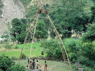 (1981年秋の記録) (第24回) 昨日はポーターにキャンプ地変更の連絡が不徹底であったために、彼らは戸惑い全員がキャンプ地に到着したのは夕暮れとなってしまった。 シェルパに、キャンプをする場所をポーターによく知らせること、また、少ない人数であり先頭と最後尾が長い距離をあけずに歩くことも伝えるように指示をする。 今日も7時30分に出発。ここから次のキャンプ地グルジャガウンまでは標高差にして約1000m登らなければならない。 このキャラバンルートでは標高が最も低いタムール河の川底地帯をひとりで歩いていると子供たちの歓声が聞こえて来た。 その声の方向に目を向けると「おっ、あれは何だ」と、びっくりする。見たことのない凄い装置で数人の子供たちが遊んでいた。 集落の広場に大きな数本の孟宗竹で組み上げた巨大なブランコである。その高さは十数メートルほどもある。 先端からロープを下げたブランコに乗って漕いでいる。その揺られる様は凄い迫力である。 ブランコが揺れる方向に支柱(竹)はしなり長いロープのブランコは空高く舞い上がる。乗っている人が飛んで行きそうだ。まるでサーカスさながらの豪快な遊びである。 日本ではおそらく『危険である』と使用禁止になることであろう。 やがてキャラバンルートは棚田の水田地帯に沿った登り路に変わる。稲穂の刈り取りは標高の低いところから始まり徐々に上部へと移動している。 晴天で風もほとんどなく曲がりくねった坂路が続き、額を流れ落ちる汗が目にしみる。 ようやく尾根に達し後方を振り返ると、荷物を背負って登って来るポーターの背後にジャヌーとカンチェンジュンガ小さくなって見えている。 気候は秋の澄んだ空気となり往路の時よりも山容がはっきりと見えている。ジャヌーはもう、あんなにも遠い彼方になってしまった。 この付近から初めて夕空に浮かんだジャヌーを見て興奮した時のことを思い出す。 14時ごろにはグルジャガウンの集落に到着する。さっそく、チャンかロキシーを求めて民家に行く。しかし、ないようである。 その代わりに軒下にザルに入った里芋らしき黒っぽい芋が目に留まり少し(3kg/7Rs)分けてもらう。キャンプを設営するとさっそく蒸かして皮を剥いて食べてみる、‘旨い’里芋の味だ。たしかに里芋である。 夕方には残照のジャヌーとカンチェンジュンガがヒマラヤの空に同化していく様子をカメラを片手にして眺める。 ジャヌーもこれで見納めである。ここから先になるともう見ることが出来なくなる。 11月6日 曇り 7時10分出発。今日もグパポカリまでは急勾配の登りが続く。ポーターの進み具合に合わせてゆっくりと歩を進める。今日の空は一面雲に覆われているために気温があがらない。やがてガスも立ちこめてますます暖かくなる状況ではなくなった。私たちは空身同然で歩いているため身体が温まらない。 したがってポーターと同じペースで歩き休憩すると寒い。やむを得ない、彼らと行動を共にせず、寒さを感じない程度の速さで進み先行することとする。ガスで視界が悪い山路を歩き続けるとやがてガスにけむるグパポカリの集落に到着する。時間はまだ13時すぎであった。 朝食はシェルパに負けないほどの量を食べて歩き始める。しかし、すぐに腹がへり弁当はいつも昼を待たずになくなる。 腹がへると寒い。何か珍しい食べ物はないかと集落の民家をのぞいて廻る。食べ物やチャンはないがロキシーがあるという。さっそく譲り分けて貰い空きっ腹に何杯か流し込み腹の虫をなだめる。アルコールがまわり冷えた身体が温まると一時的に落ち着く。 帰りがけに天井の梁から豚肉の塊が吊り下げてあるのが目に留まる。おやじさんに無理をいって分けて貰う。夕食は久しぶりに肉が入ったカレーを食べることができた。(いつもは肉の入ってないベジタブルカレーである) 標高が2900mほどあり夜になると一段と冷え込む。 11月7日 曇り時々晴れ 夜中に寒くて眠れず梱包荷物を開けて股引を取り出してはく。朝方の冷え込みは厳しく夜露が凍り天幕はバリバリである。周辺は霜で真っ白となり霜柱は10cmほどにもなっている。 凍った天幕が小さくたためない。それをポーターの荷物の上に無理やりくくり付けて8時すぎに出発する。 今日のルートには登りは少なくほとんど平坦のハイキングコースである。 したがってポーターの歩きも速い。雲の切れ間から時折、マカルー(8481m)が覗く尾根道を快調に飛ばして歩く。11時半にチョーキ着。そんなに急ぐ必要はない、ここで全員大休止とする。キャンプ地ズールパニには15時ごろに到着した。 キャンプ地は近くに民家が3軒あるのみでちょっと寂しい場所だ。民家には必ずニワトリや豚、牛を家の周りで放し飼いしている。 夕方になると家族みんなで牛、豚、ニワトリ、ヒヨコとそれぞれの囲いの中に追い込む。そして私たちは毎日卵を買い集める。毎晩のご馳走は玉子焼きである。 11月8日 晴れ 定刻の7時30分に歩き始める。今日